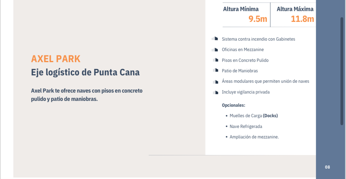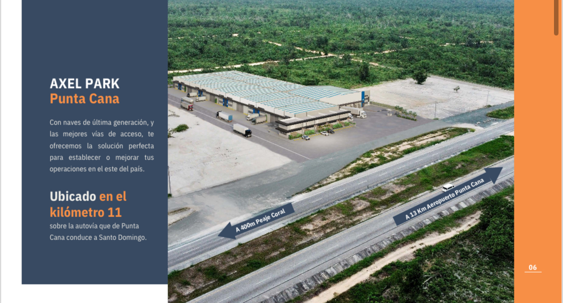 AXEL PARK Punta Cana: Disponibilidad de Naves y Locales Comerciales en Alquiler Ubicación estratégica: KM 11 de la Autovía de Punta Cana, un lugar ideal para operaciones logísticas o comerciales con excelente exposición y accesibilidad. Naves industriales Naves de última generación con características destacadas: • Altura: 9.5-11.8 mts. • Oficinas en mezzanine y pisos de concreto pulido. • Sistema contra incendios, vigilancia privada, y patios de maniobra amplios. • Opcionales: muelles de carga, refrigeración y ampliación de mezzanine. Disponibilidad y precios: • Área: Desde 487.10 m² hasta 730.50 m². • Precios: Desde USD 3,959.17/mes hasta USD 5,967.68/mes, a razón de USD 8.5/m². Locales comerciales • Diseño moderno con mezzanine incluido. • Áreas desde 96.62 m² hasta 121.84 m². • Precio de alquiler: Desde USD 1,207.35 hasta USD 1,523.55. Consulta hoy mismo para más detalles y asegura tu espacio en este proyecto de alto nivel!