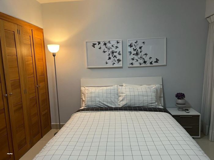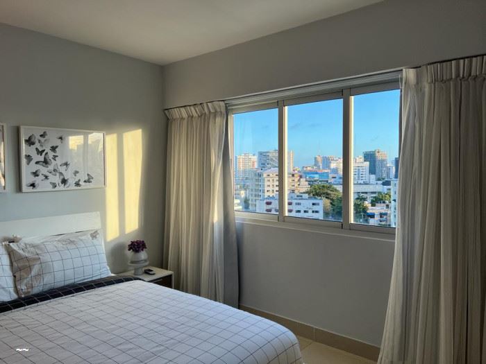 CityMax Santo Domingo Alquila apartamento totalmente amueblado, piso alto, en Piantini, próximo a la Abraham Lincoln y Lópe de Vega Cuenta con una excelente ubicación cerca de plazas comerciales y supermercados Piso 11 128 mt 2 habitaciones 2 Baños Sala Comedor Cocina equipada Área de lavado equipada Balcón Excelente vista a la ciudad 2 parqueos techados Ascensor Lobby Climatizado Seguridad 24 horas Portón Eléctrico Gimnasio Áreas sociales Terraza destechada CLAVE INTERNA PAA-001-07-23