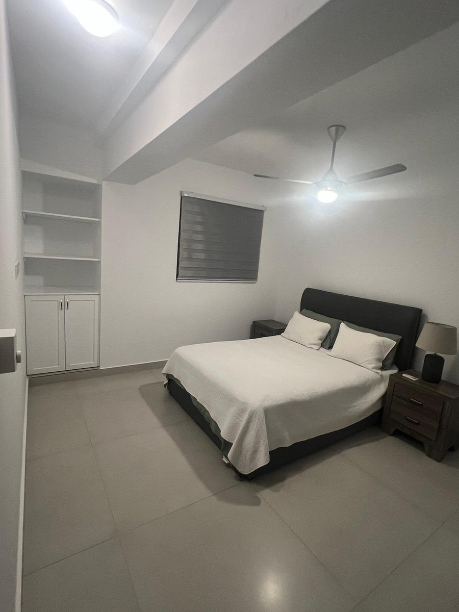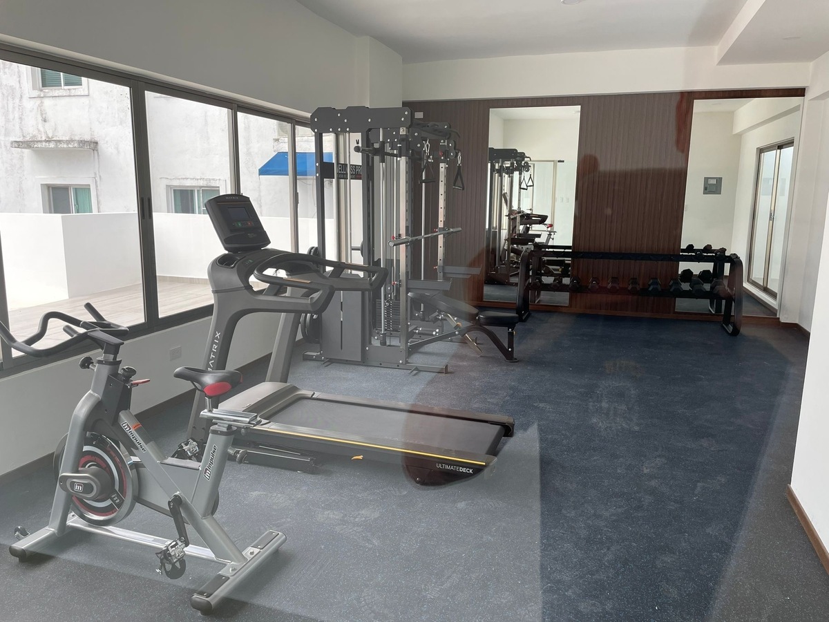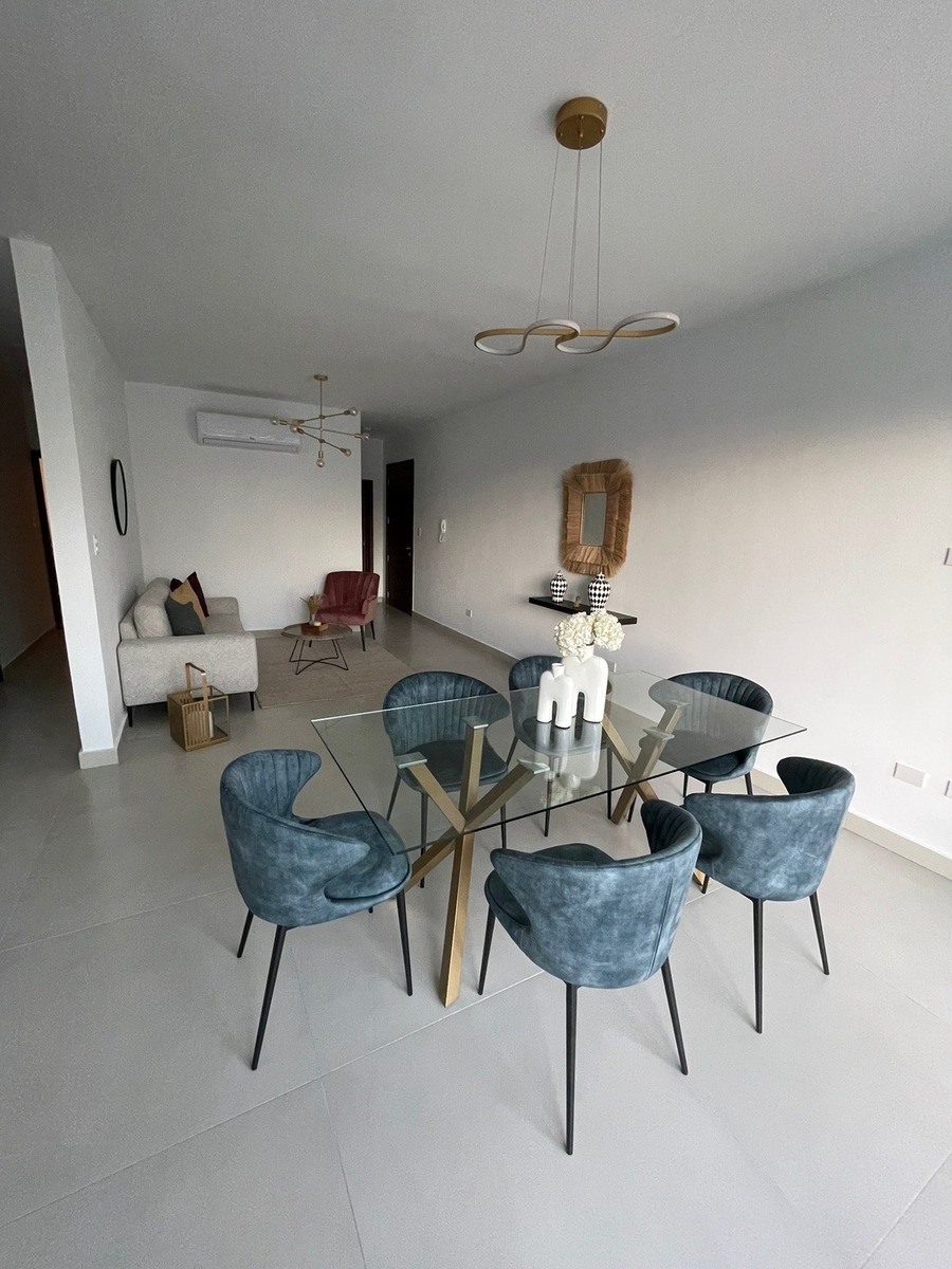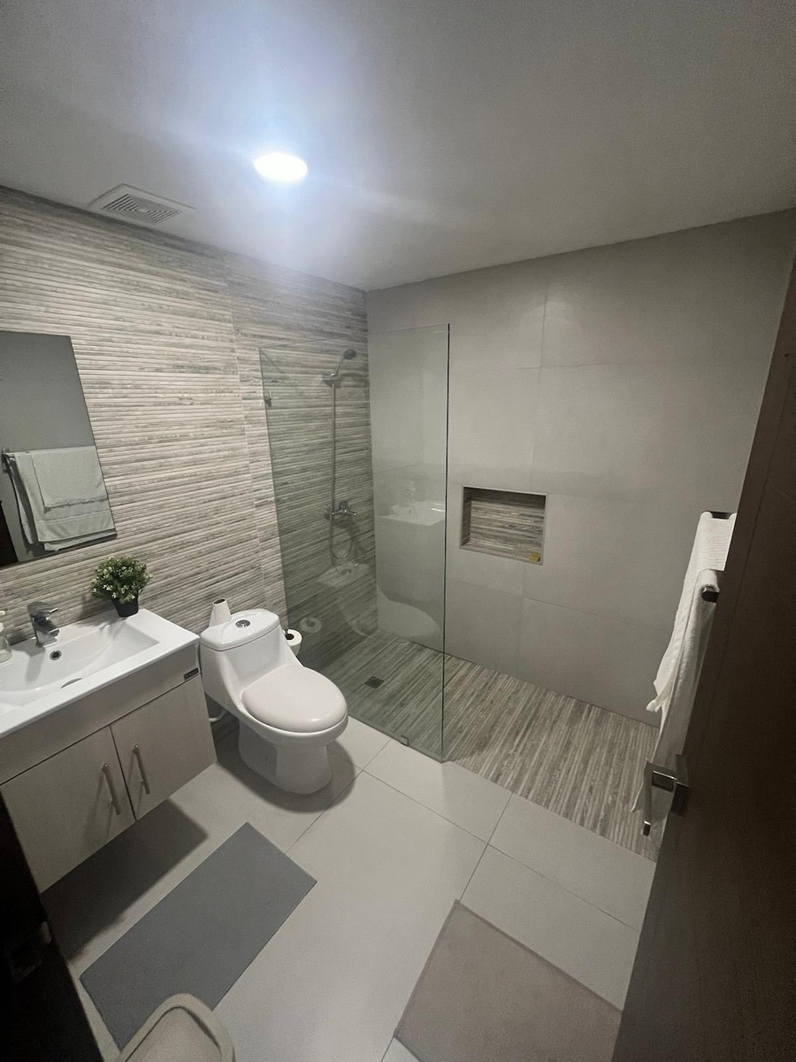3 habitaciones, 2.5 baños, habitación y baño de servicio, cocina completa, aires acondicionados en habitaciones y salón así como abanicos. 120 m2 2 Parqueos Gimnasio y sala multiuso en azotea así como jacuzzi y amplia terraza Lobby y seguridad 24 horas
