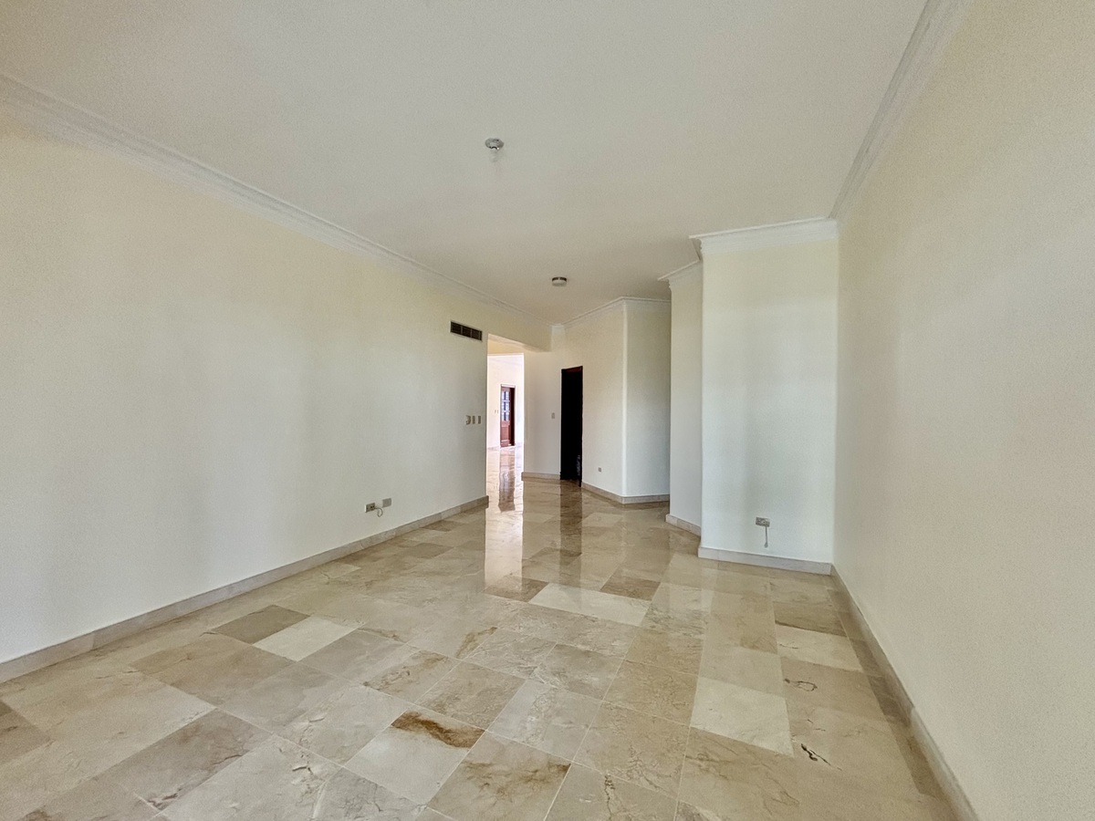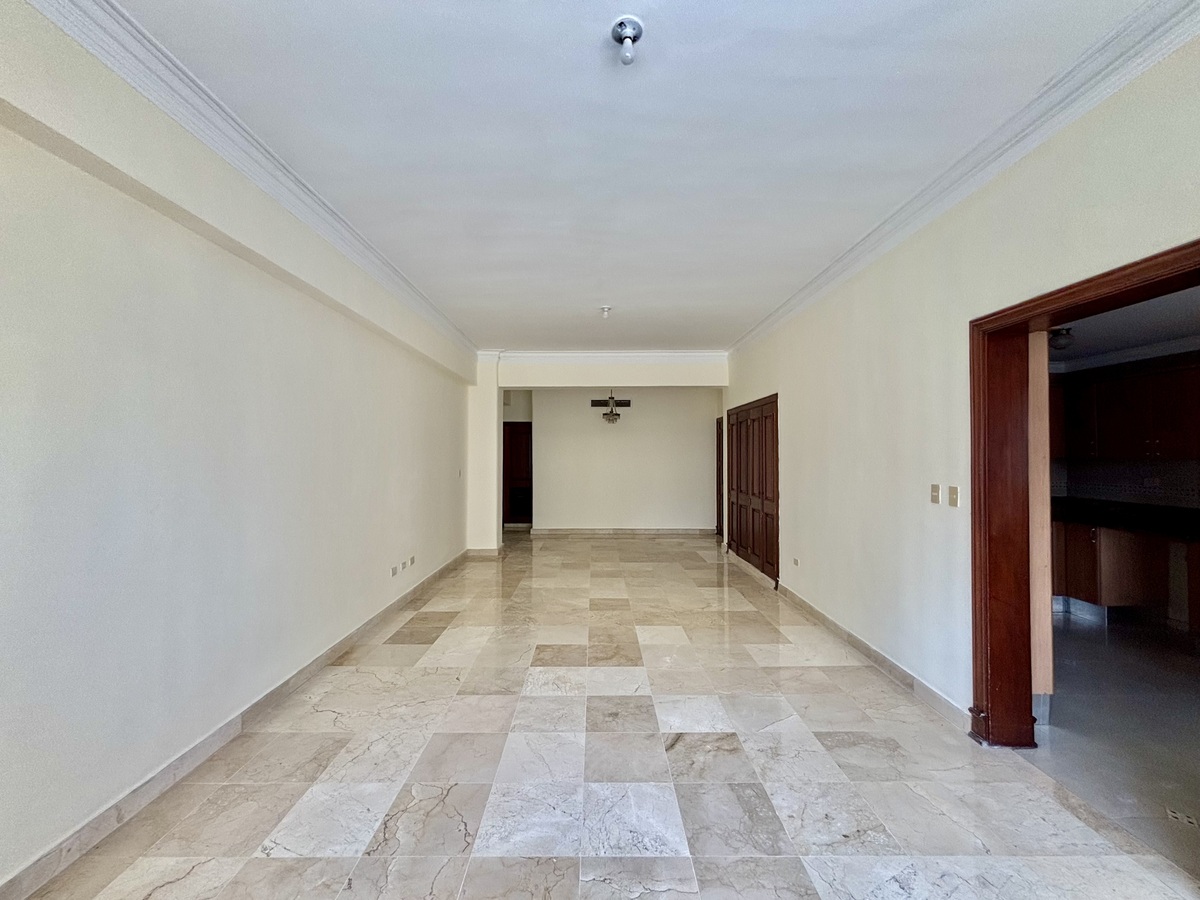 Apartamento ubicado en el nivel cinco de torre clásica de reconocida constructora en Piantini. Tres apartamentos por nivel, 23 apartamentos en total. • Amplio balcón cerrado con ventanales que también pudiera funcionar como estudio • Sala • Amplio comedor independiente • Cocina cerrada • Medio baño • Tres habitaciones. La principal con acceso al balcón, dos walk-in closets y baño • Una habitación secundaria con un walk-in closet, un clóset regular y baño • Una habitación secundaria con walk-in closet y baño • Clóset de ropa blanca • Tres parqueos a nivel de calle (dos lineales y uno independiente) • Locker • Área de lavado • Cuarto de servicio con su baño Pisos y baños en marmol La torre cuenta con lobby, dos ascensores, planta eléctrica, gas común.