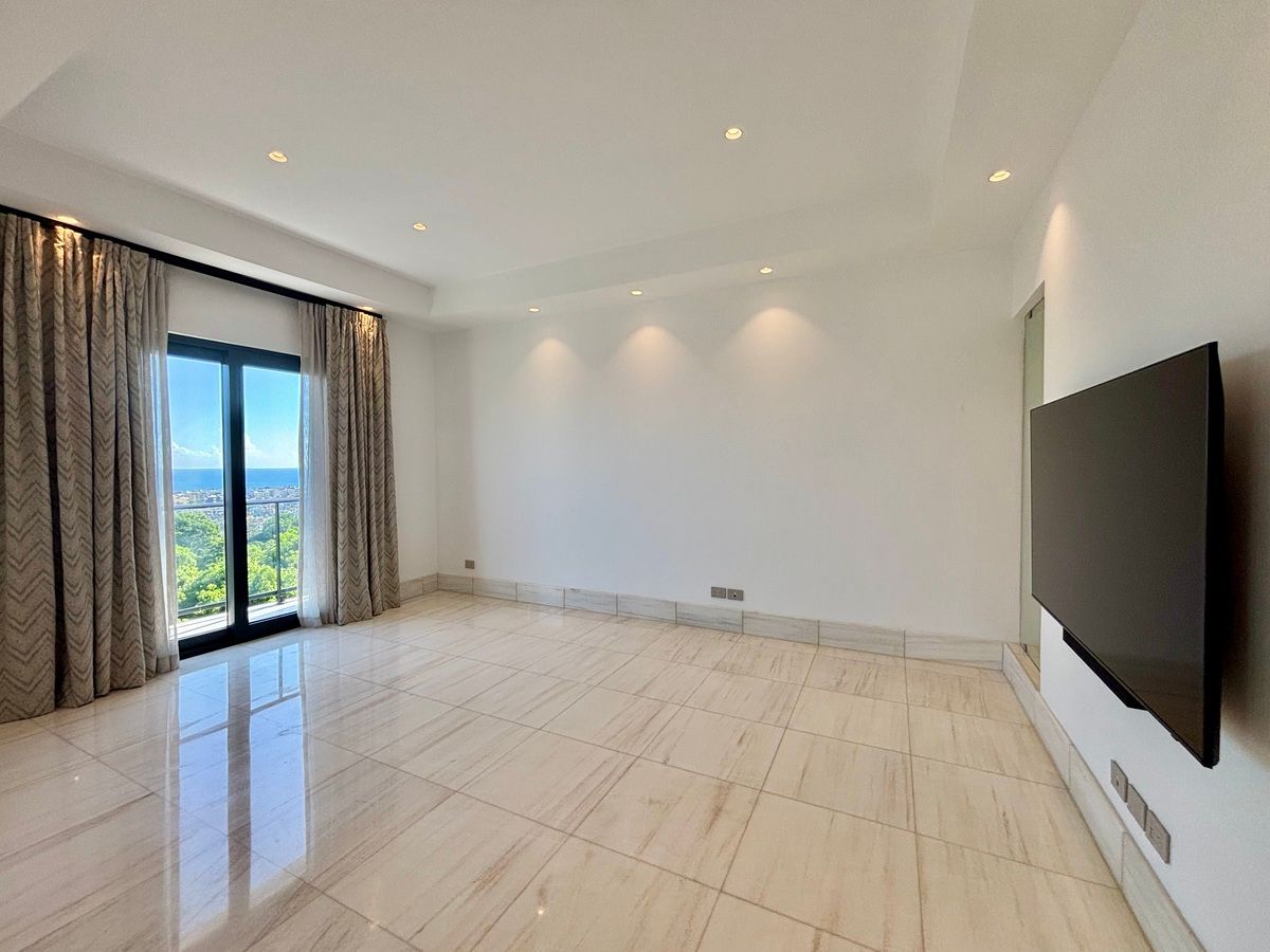 Apartamento a estrenar en lujosa torre de la Ave. Anacaona con vista al Parque Mirador y al Mar. Dos apartamentos por nivel con acceso con dos ascensores de lujo al recibidor común de los dos apartamentos. Sala comedor, estudio con pequeño balcón y vista al mar, balcón terraza frontal, terraza trasera, medio baño, tres habitaciones con su baño y walk-in closet forrados en cedro y con organizadores. La habitación principal con vista al mar. Estar familiar con amplio clóset de ropa blanca con organizadores. Amplia cocina con isla y numerosos muebles modulares. Área de lavado con preinstalacion para cocina auxiliar, cuarto de servicio con su baño. Acceso a ascensor de servicio. Dos escaleras internas. Tres parqueos independientes en el segundo nivel, un locker en el piso 5. ÁREAS SOCIALES: Amplio lobby climatizado, parqueos para visitantes, garita de seguridad. Area social ubicada en el quinto nivel con piscina con vistas al parque, area de solearse, ducha exterior, BBQ, salón uso múltiple para eventos con cocina de apoyo, baños, area de juego de niños, gimnasio equipado, baños comunes. Segunda área social ubicada en el rooftop del nivel veintiuno con amplias terrazas, dos áreas de BBQ y baños comunes. OTROS: Lounge para choferes Baños y lockers para empleados Planta de emergencia Cuarto Frio de deshechos solidos Oficina Administrativas Sistema de Seguridad Detección de Incendios Direccionables Circuito cerrado de televisión Digital a color con cuarto de seguridad Acceso Peatonal desde Ave. Anacaona