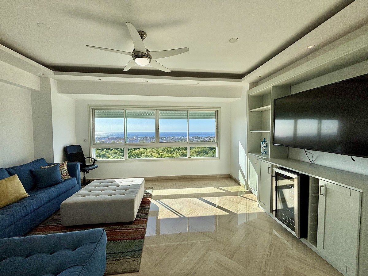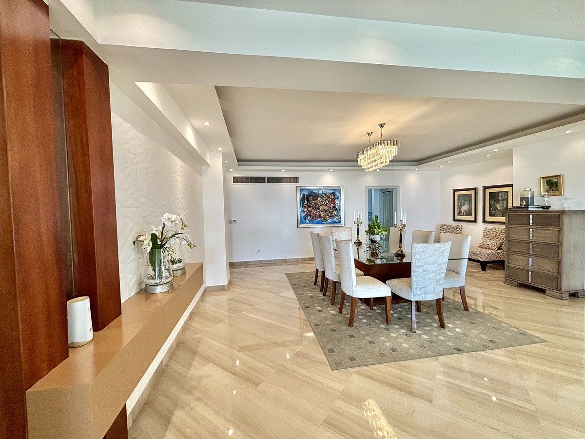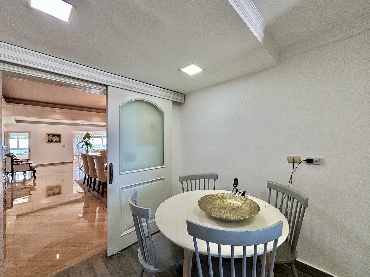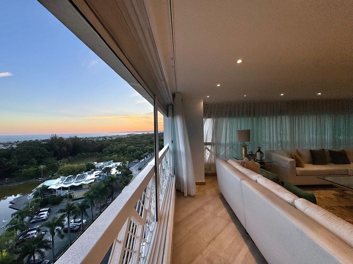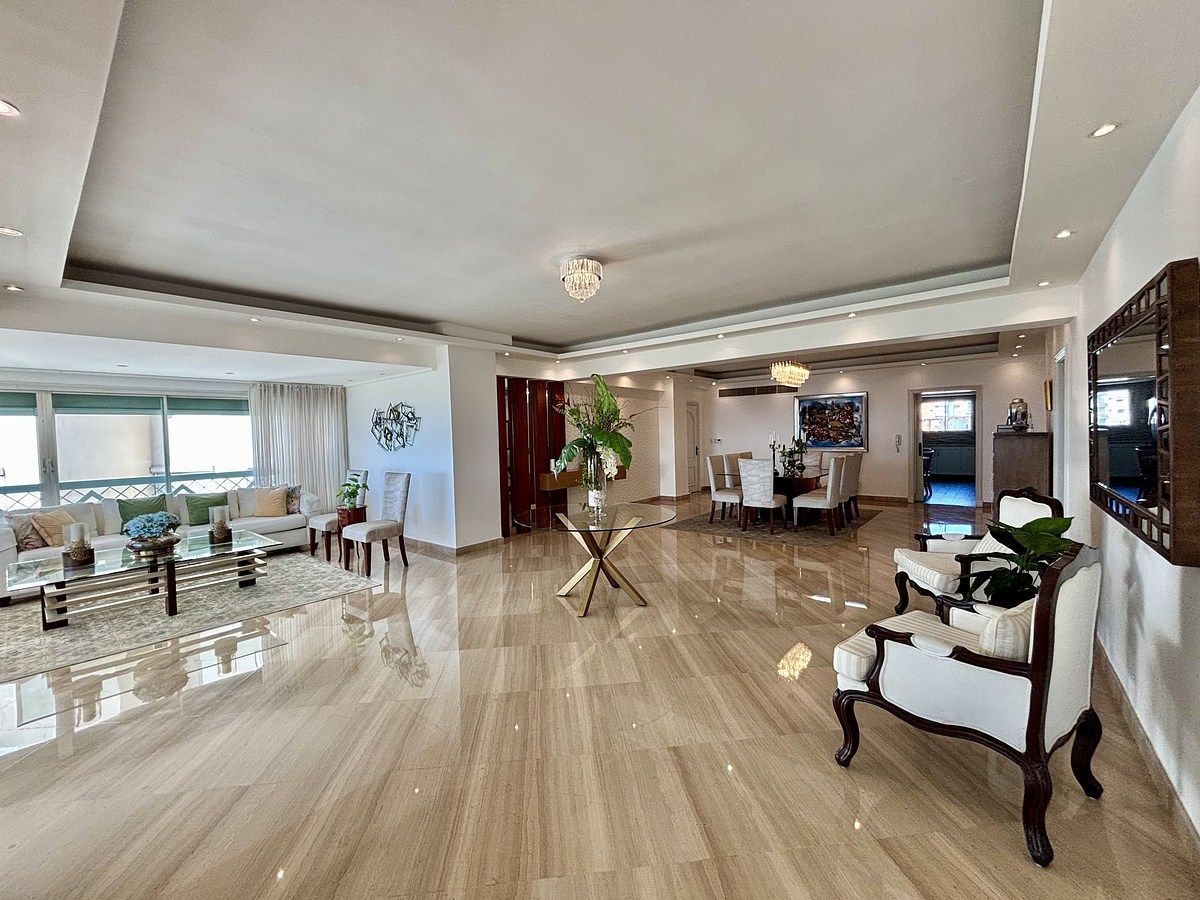 Nivel 8 345M2 Vista al mar y al parque Dos apartamentos por piso Totalmente amueblado Áreas Sociales: Piscina, gimnasio, salón, terraza, área niños, lobby Distribución: • Lobby compartido con apartamento vecino • Recibidor • Amplia área de sala comedor con vista al mar • Estudio con vista al mar • Medio baño • Tres habitaciones con sus baños, la principal con WC y las secundarias con clóset regular • Clóset de ropa blanca • Cocina fría con área de comedor • Cocina caliente con área de lavado • Habitación de servicio con baño • Dos parqueos • Un locker Shutters, ventanas anti ruido, ascensor de servicio