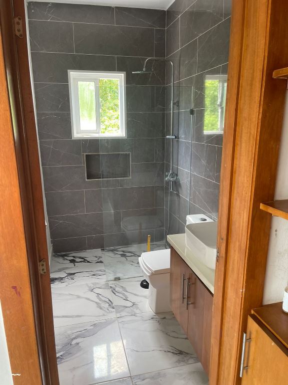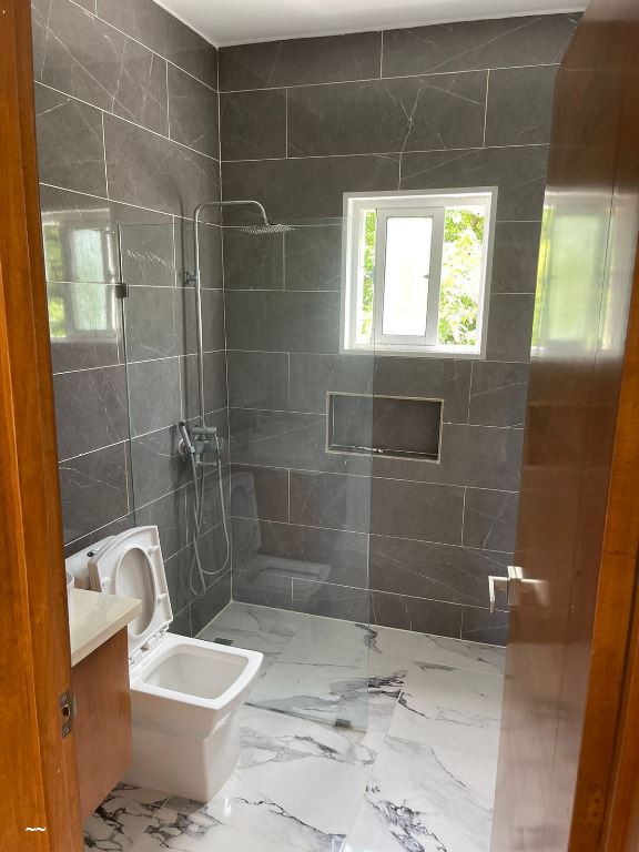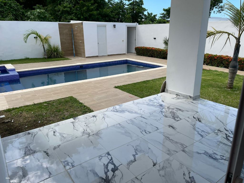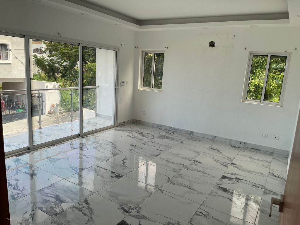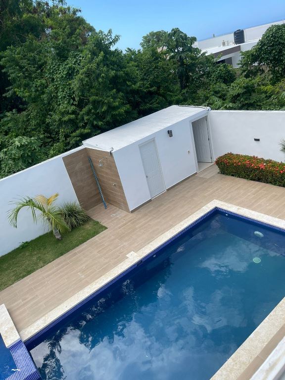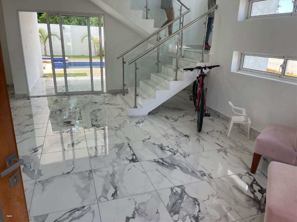 Dos niveles 3 habitaciones 2.5 baños Sala Comedor Cocina Marquesina para 4 vehículos Área verde Quiozco Piscina Terraza Precio: RD$90,000 El cliente debe comprar el agua de camiones