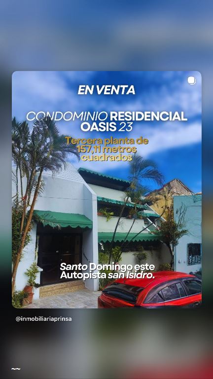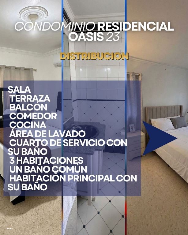 ??? En venta – Amplio apartamento en Condominio Residencial Oasis 23 Descubre este cómodo apartamento ubicado en tercera planta, con 157.11 m² de espacio ideal para vivir con comodidad en Santo Domingo Este. Distribución: ?? Sala ?? Terraza ?? Balcón ?? Comedor ?? Cocina ?? Área de lavado ?? Cuarto de servicio con su baño ?? 3 habitaciones ?? Habitación principal con su baño ?? Un baño común $9,400,000 Un apartamento pensado para quienes buscan espacios amplios, funcionalidad y una excelente ubicación. ?? Condominio Residencial Oasis 23 – Santo Domingo Este ?? Contáctanos 8299790075 /8094270550 para más información o agendar una visita.